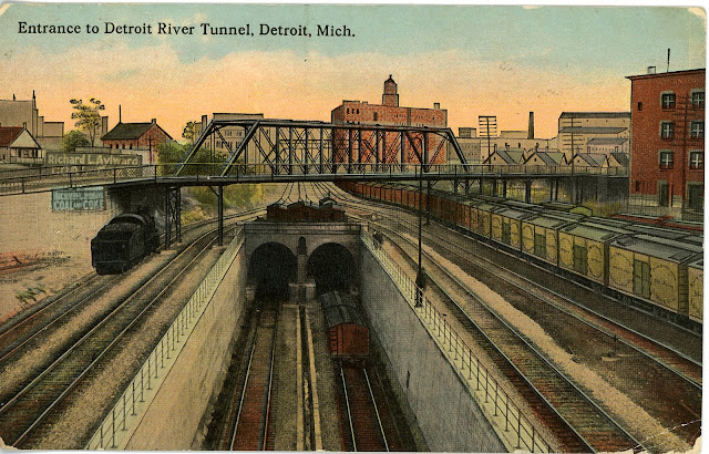 This circa 1920 postcard is part of a small series that gives us an insight into the Michigan Central's Detroit River railroad tunnel connecting Canada and the US. Unlike the St. Clair tunnel box cab motors that used overhead catenary, this tunnel operated steeple cab electric motors using a 3rd rail power supply. This can be seen just off to the outside of each track in this card below.